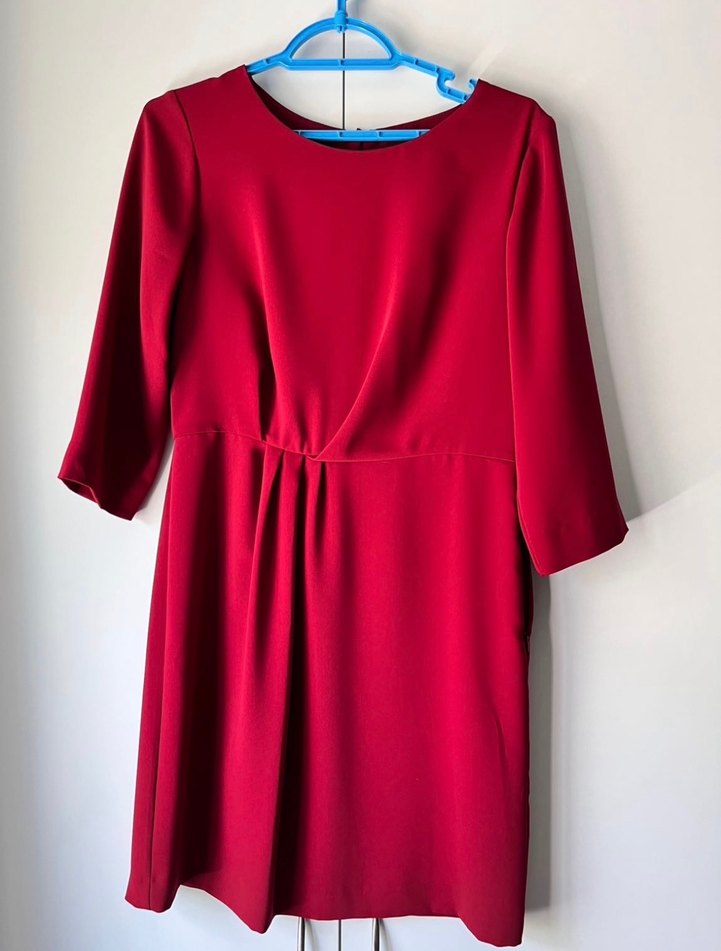 Koyu kırmızı midi boy, drapeli, yuvarlak yakalı, kısa kollu, salaş kesim, sade ve minimalist tarzda kadın elbisesi, ofis kullanımı için uygundur.