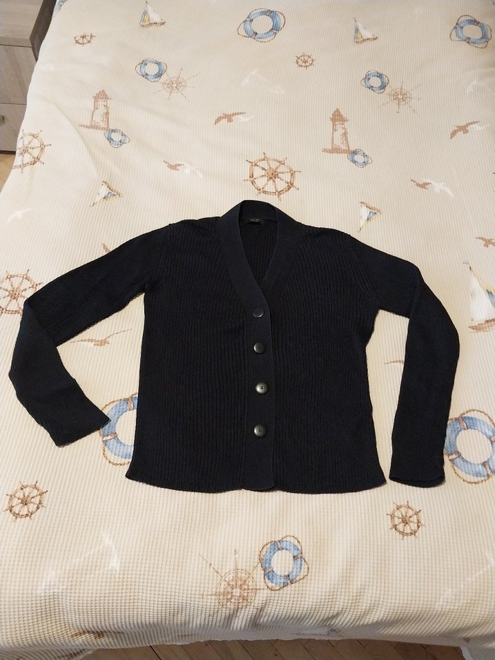 siyah, ipek ve pamuk karışımı yumuşacık ,düğmeli, uzun kollu, normal boyda, fit kesim kadın hırka. Notlu yaka detayıyla günlük kullanıma uygundur. ürün prjinaldir ve tertemiz durumdadır