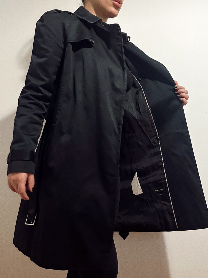Siyah renkte, %100 pamuk kumaştan, normal boy midi trençkot. Uzun kollu, yakası kesik ve kemerli detaylı, rahat kesimdir.