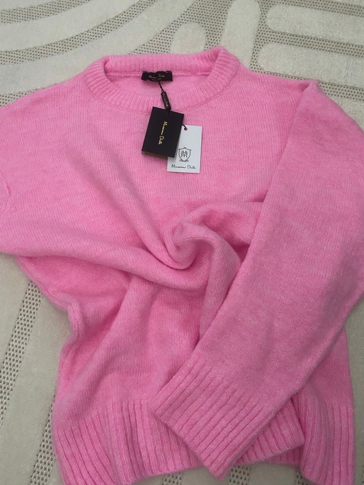 Pembe renkli, yünlü örgü kazak, yuvarlak yaka ve uzun kolludur. Rahat, normal midi boyunda, gündelik kullanıma uygundur. Massimo dutti sıcacık kazak