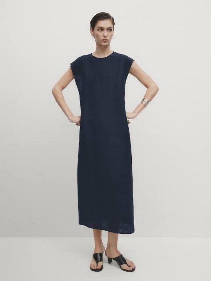Massimo Dutti Lacivert Uzun Kolsuz Keten Elbise