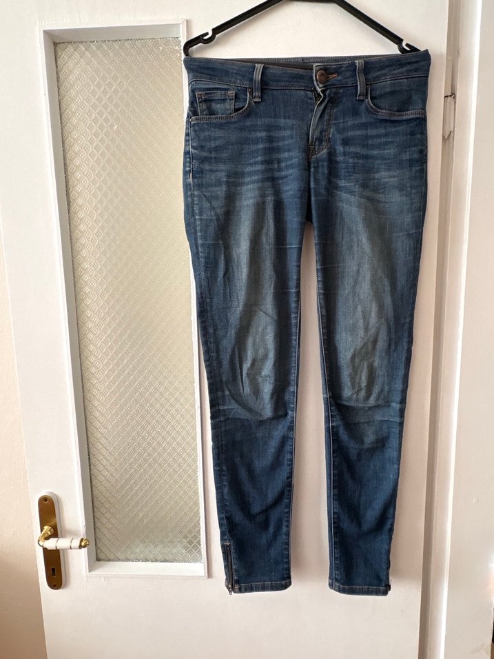 dar kesim, fermuarlı detaylı mavi denim jean. Normal boyda, günlük tarzda. Ürün bavulda kaldığı içim buruşuk ütülenince geçiçektir