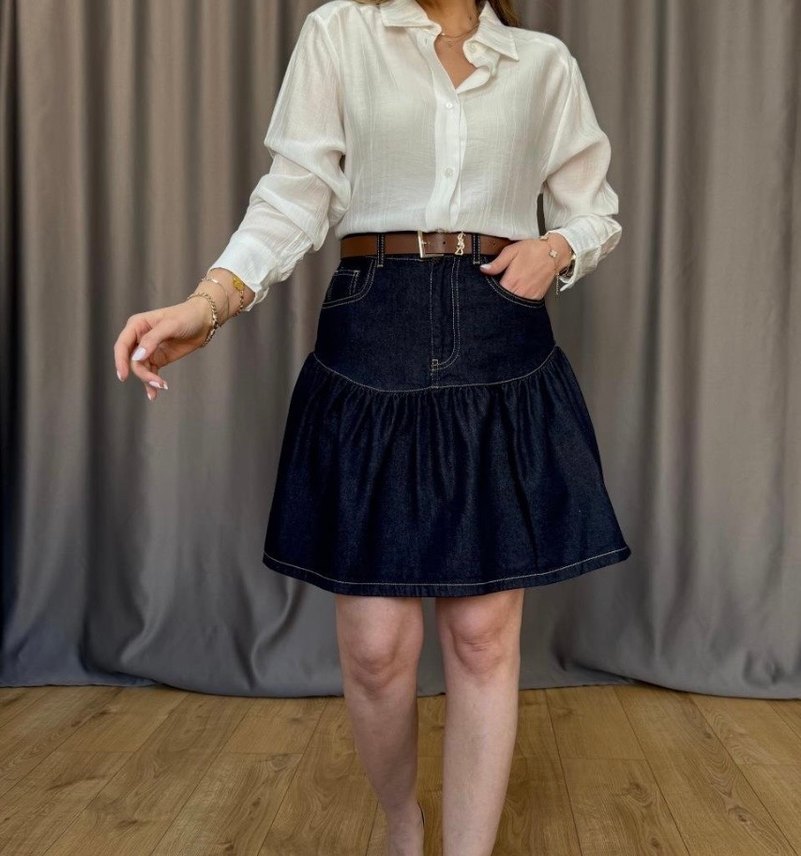 Lacivert kot kumaştan yapılmış, volanlı ve bol kesim midi etek. Günlük rahat kullanım için uygundur, sokak stili görünüm sunar.