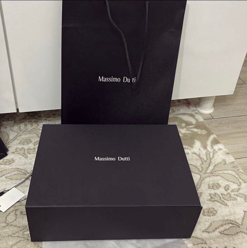Massimo Dutti marka siyah hediye kutusu ve çantası, üzerinde beyaz marka yazısı bulunuyor.