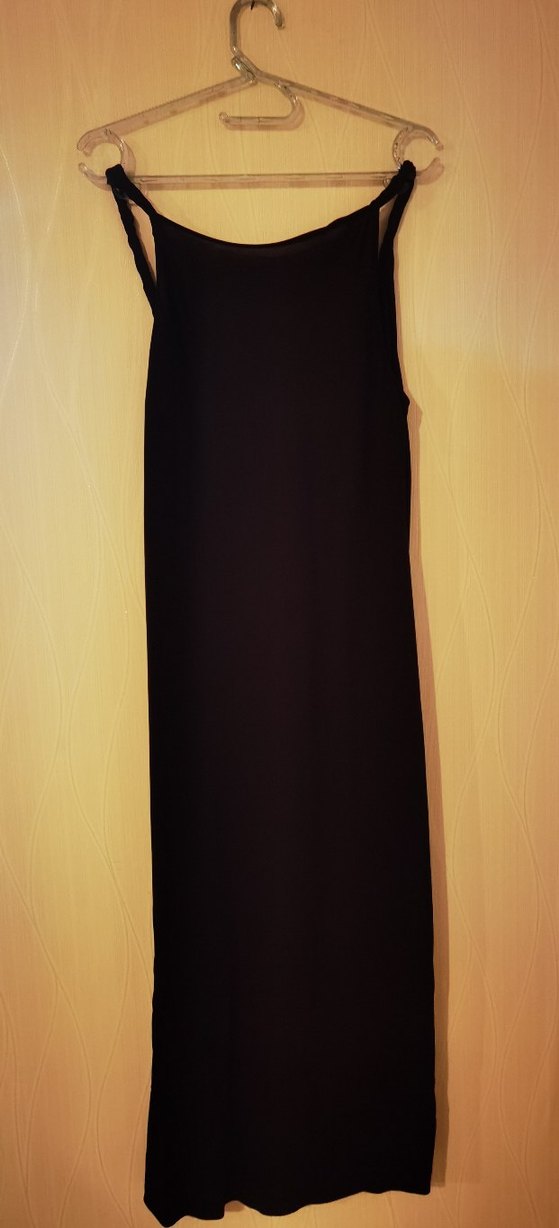 Siyah, uzun ve kolsuz elbise, örgü dokusuyla minimalist gotik tarzı yansıtıyor.