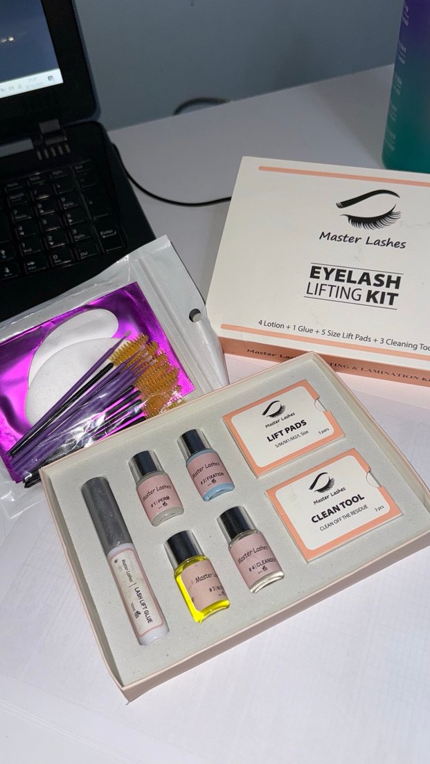 Master Lashes kirpik lifting seti, 4 losyon, 1 yapıştırıcı, 5 boyut lift pedi ve 3 temizleme aracı içerir. ✨