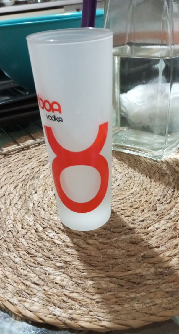 Mat camdan yapılmış, üzerinde büyük kırmızı baskı ve 'vodka' yazısı bulunan shot bardağı.