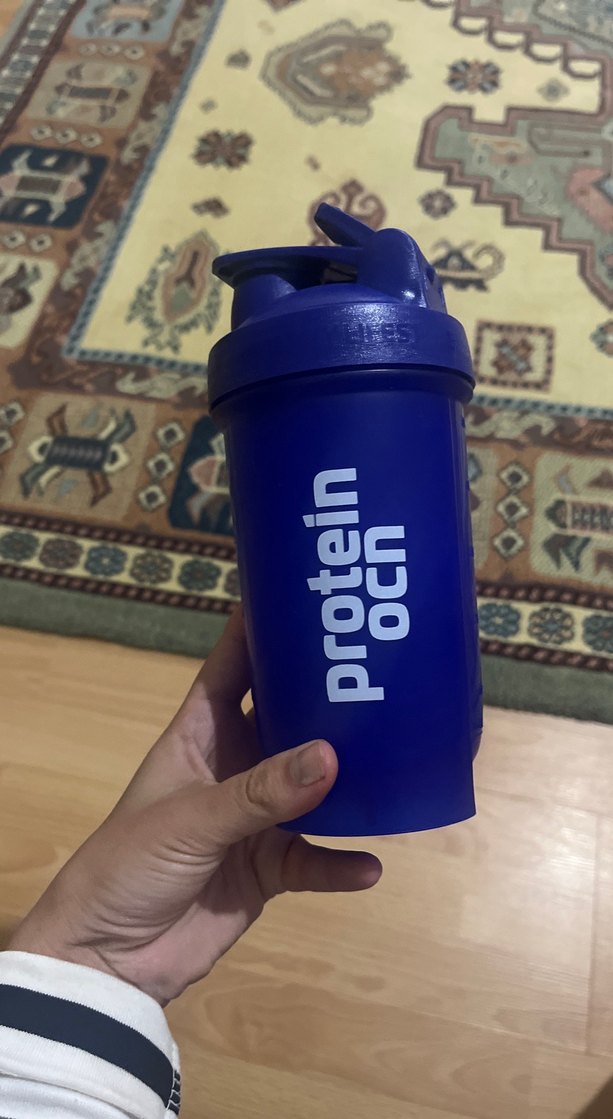 Kapaklı, koyu mavi renkli 'protein ocn' yazılı bebek biberonu. Kolay içim ve taşıma sağlar.