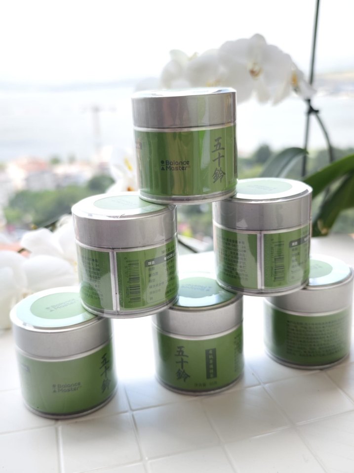 Yeşil krem, küçük gümüş kapaklı kutularda piramit şeklinde dizilmiş, beyaz yüzeyde ve flu dış mekan manzarasıyla.