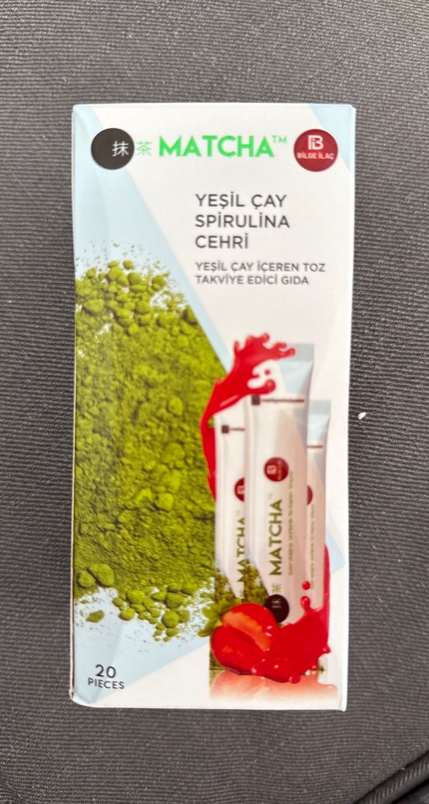 Yeşil çay ve spirulina içeren matcha tozu, 20 adet. Takviye edici gıda olarak kullanılır. İyice bakarak alın iade yoktur