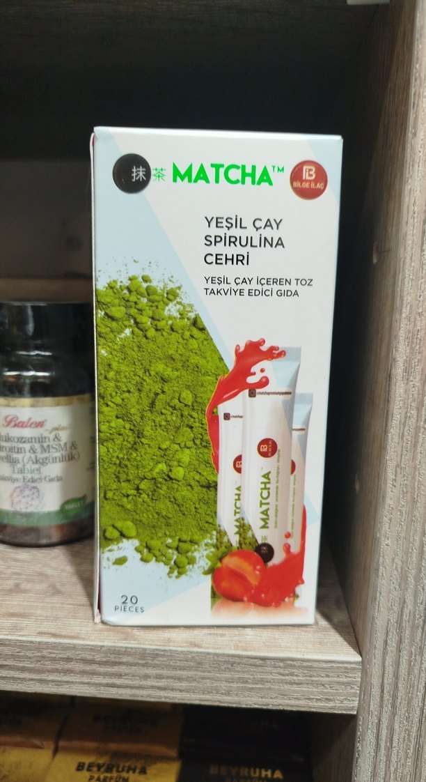Yeşil çay ve spirulina içeren, takviye edici gıda olarak sunulan 20'li Matcha tozu.