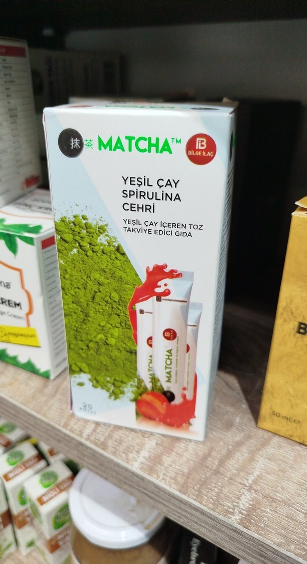 Bilge İlaç'tan yeşil çay ve spirulina içeren hafif yeşil renkli toz takviye edici gıda.