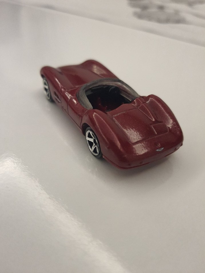 Koyu kırmızı renkte, parlak yüzeyli ve detaylı tekerleklere sahip oyuncak araba. Oyun veya koleksiyon için uygun.