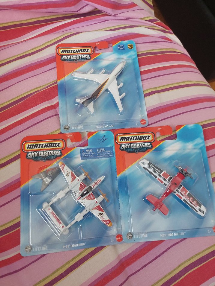 Matchbox Sky Busters renkli oyuncak uçak seti, üç detaylı model içerir. Orijinal ambalajında, koleksiyon veya oyun için uygundur. ✈️