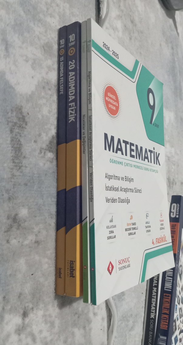 Algoritma, istatistik ve olasılık konularını içeren 9. sınıf matematik kitabı ile 20 adımda fizik rehberi seti. Sonuç ve İsabet yayınları.