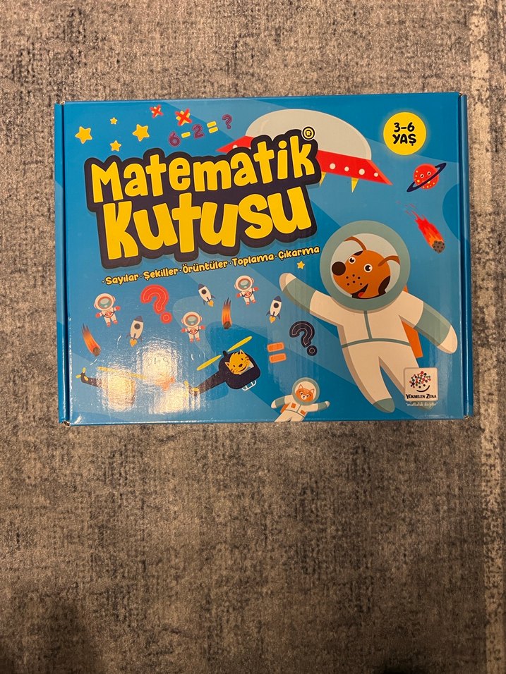 Matematik Kutusu, 3-6 yaş çocuklar için sayılar, şekiller, örüntüler, toplama ve çıkarma öğreten eğitici bir oyuncaktır. Canlı renkler ve uzay temalı çizimler içerir.