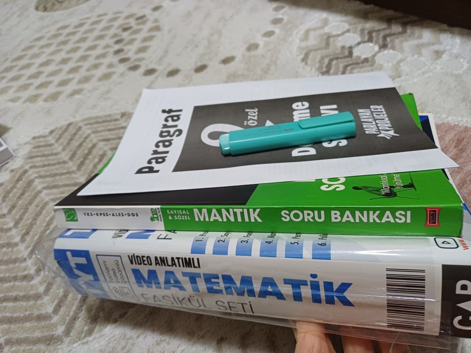 Matematik soru bankaları ve paragraf çalışma kitabından oluşan sınav hazırlık seti. Yanında fosforlu kalem ve silgi bulunur. çap fasiküllerde fonksiyon fasikülünde birkaç sayfada ödev vb notlar vardır