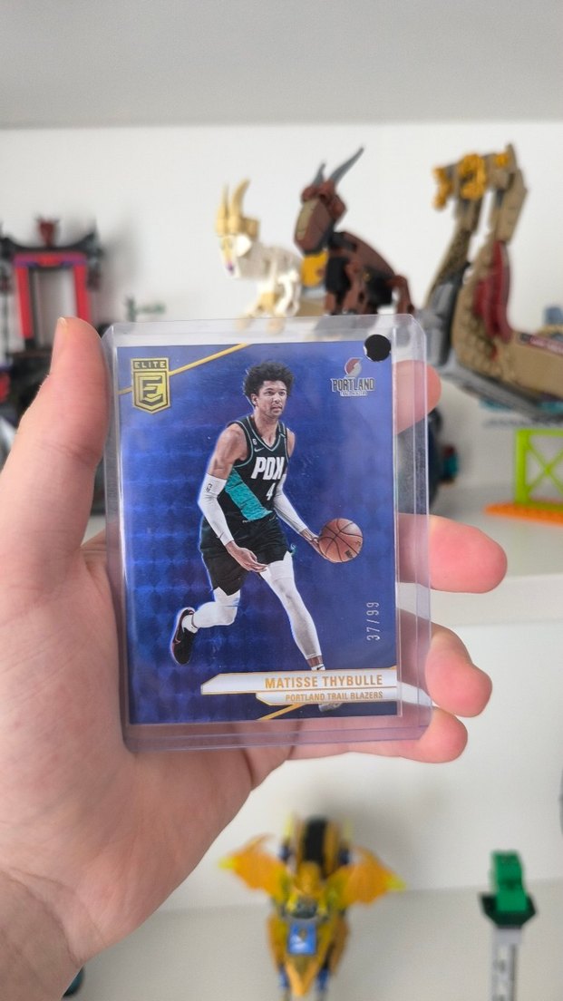 Portland Trail Blazers oyuncusu Matisse Thybulle'ün basketbol kartı, 37/99 numaralı sınırlı üretim. Mavi arka plan ve takım formasıyla gösteriliyor.