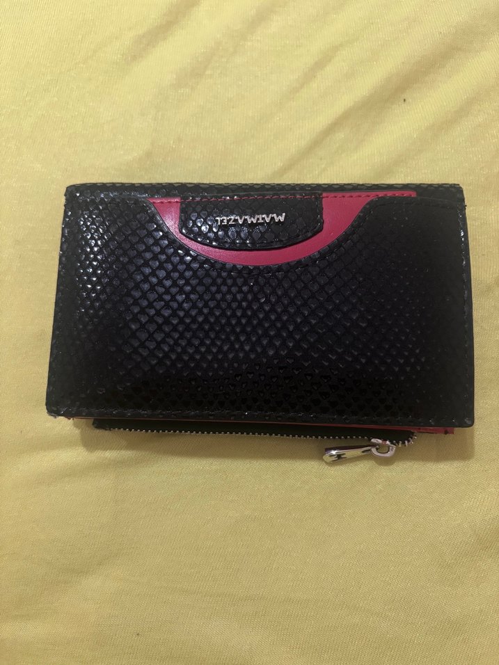 siyah yılan derisi desenli deri cüzdan, fermuarlı bölmesiyle minimalist gotik tarzda, günlük kullanıma uygun. Çok kullanışlıdır fazla cüzdanım oldugu için satıyorum