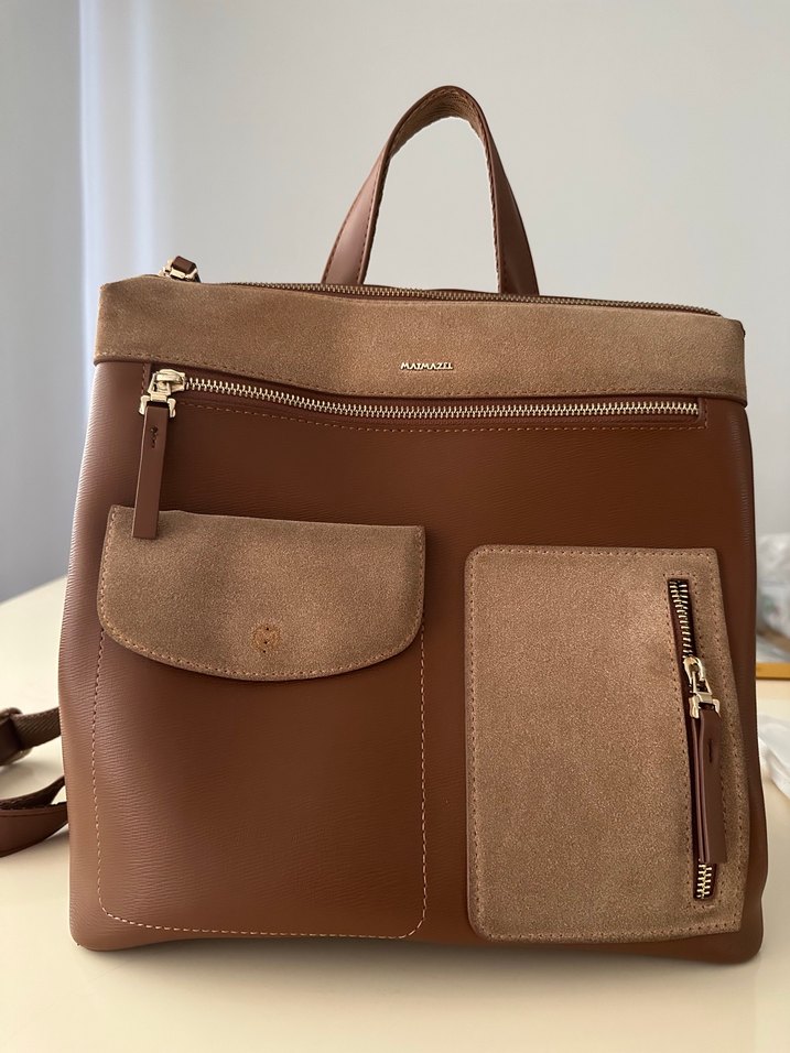 Kahverengi süet kapaklı detaylara sahip, çoklu fermuarlı ceplerle donatılmış çağdaş kadın sırt çantası. Trendy günlük kullanım için uygundur.