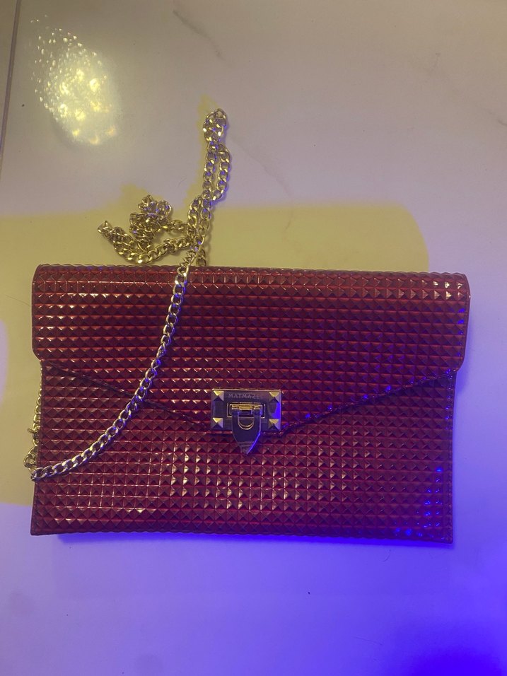 Zincir detaylı, parlak desenli kırmızı deri çanta,hem şık hem spor, iki gözü var çok kullanışlı çok az kullanıldı temizdir.