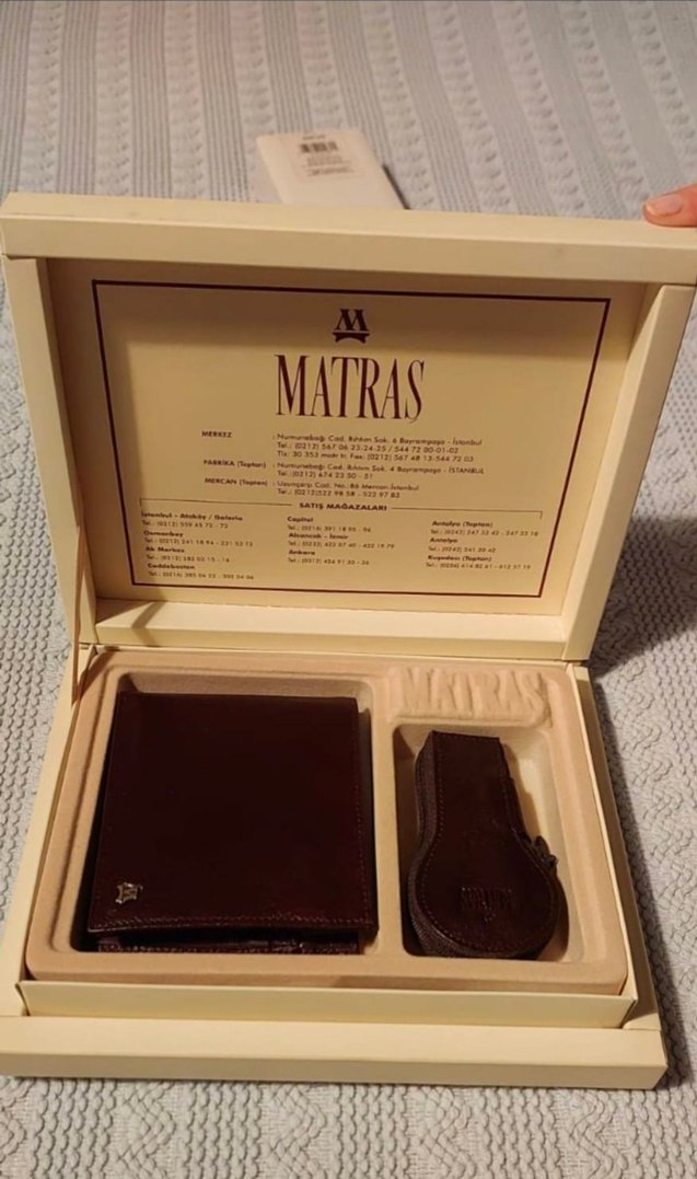 MATRAS markalı kahverengi erkek cüzdan seti, baskılı ve klasik tasarımlı cüzdan ile anahtarlık içerir. Kullanılmamış özel ambalajında