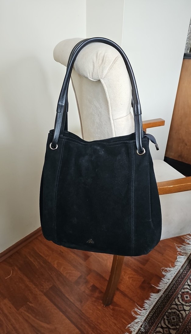 Siyah süet kadın çanta, çağdaş tasarıma sahip ve logolu detay içerir. Minimalist ve klasik şıklıkta, günlük kullanım için uygundur. Yumuşak hakiki süet ve deri malzemeden üretilmiştir. İcerisinde 2 adet fermuarlı 1 adet fermuarsız bölmesi mevcuttur. Hiç bir defosu yoktur çok az ve temiz kullanılmıştır. Resimlerde ışıktan dolayı rengi açik görünüyor ama aslı daha siyahtır.