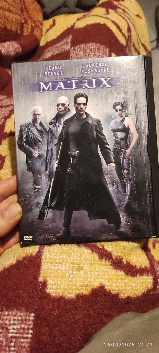 Matrix DVD'si, Keanu Reeves ve Laurence Fishburne'un yer aldığı bilim kurgu aksiyon filmidir. Kapakta ana karakterler koyu kıyafetlerle yer alıyor.