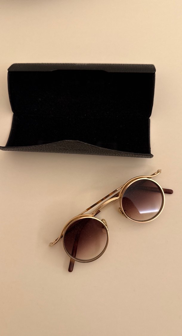 Matsuda en özel ürünü satine gold Koyu renk camlı, altın tokalı yuvarlak kadın güneş gözlüğü. Klasik zarafet ve karşı kültür Paris tarzını yansıtır. Siyah kutu ile birlikte.