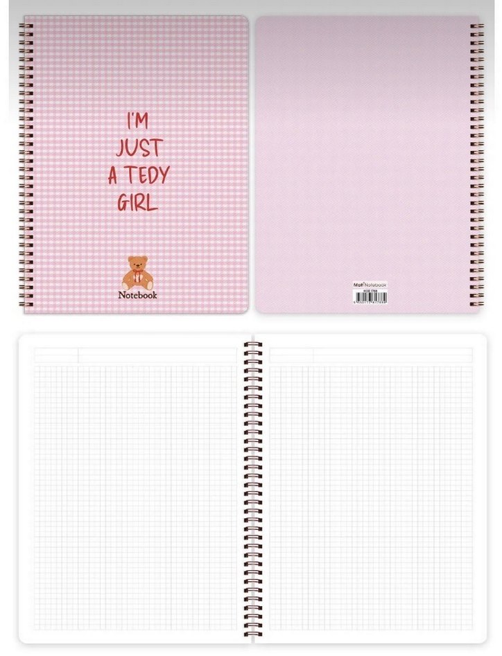 Pastel pembe kareli kapaklı, "I'm just a teddy girl" yazılı ve küçük ayıcık figürlü spiralli defter. İçinde kareli sayfalar bulunur. Az kullanıldı
