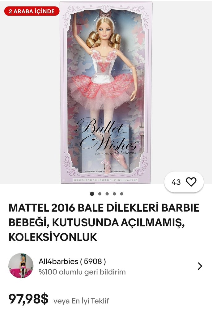 Mattel 2016 Bale Dilekleri Barbie bebek, kutusunda açılmamış ve koleksiyonluk. Pastel pembe bale kıyafeti ve kutuda iki araba bulunur.
