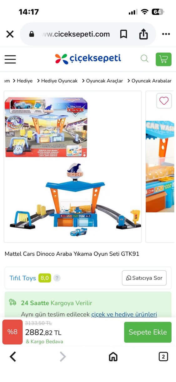 Mattel Cars Dinoco Araba Yıkama Oyun Seti GTK91, detaylı yıkama istasyonu ile etkileşimli oyun sunar. Araba sıcak ve soğuk su ile renk değiştiriyor. Sadece bir süngeri eksik ve yukarsındaki dinoco yazılı puf. O yüzden fiyatını uygun tuttum. Bulabilirsem ekleyeceğim gönerirken. Onun dışında bir problemi yok. Çocuklar saatlerce vakit geçirerek oynuyorlar, zevkli ve eğitici bir oyuncak.