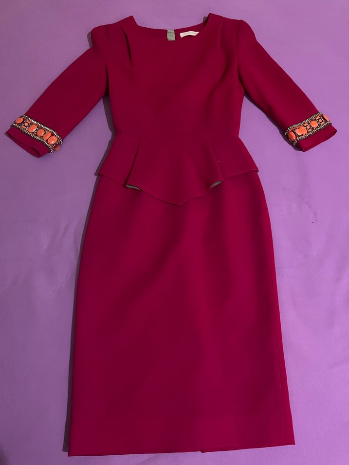 Vücuda oturan kalın, tok bir kumaşı var. Esneme payı yok. 36 beden. Arkasında ufak bir yırtmacı var. Arkadan fermuarlı. Boy 100cm. Bel 30cm. İki koltuk arası göğüs 38cm.
