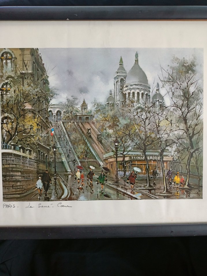 1974 tarihli paristeki kutsal kalp temalı pazar sahnesini gösteren antika litografi Fransa