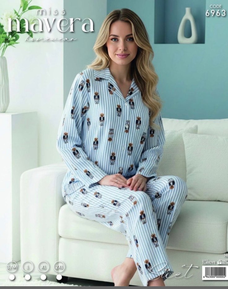 Mavera kadın pijama takımı, uzun kollu ve regular fit olup pastel mavi çizgiler ve eğlenceli desenlere sahiptir. Rahat ve konforludur. Ürün etiketlidir sorunsuzdur paketlidir yumuşak kumaşı vardır kalıbı dardır S/M/XL bedeni mevcuttur
