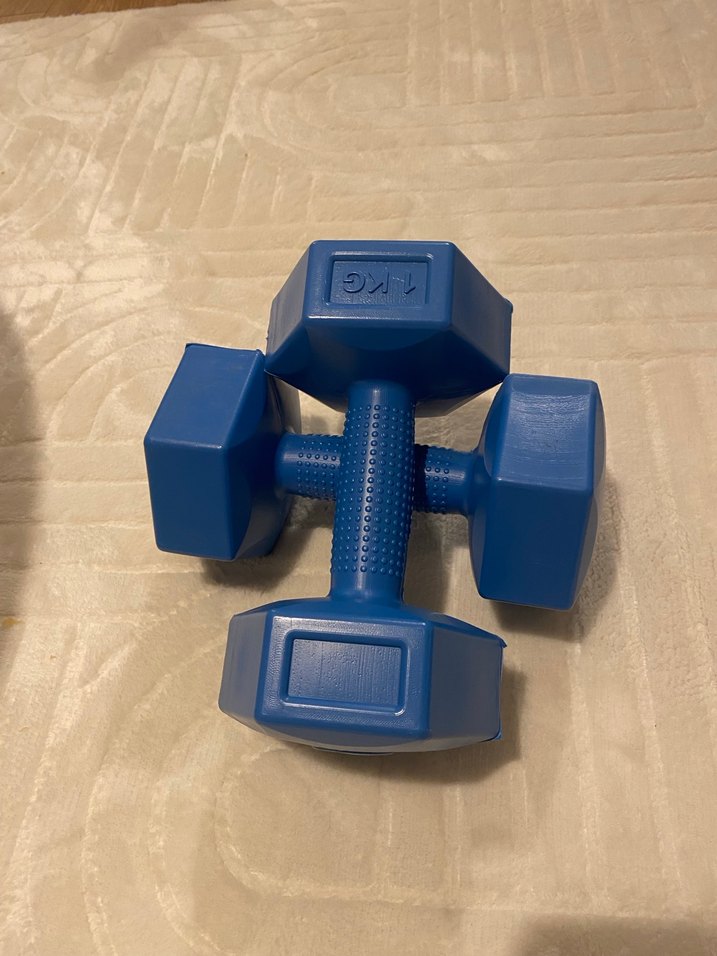Mavi renkte, 1 kg ağırlığında, tutma yeri dokulu çift dumbbell seti. Hafif güçlendirme egzersizleri için uygundur.
