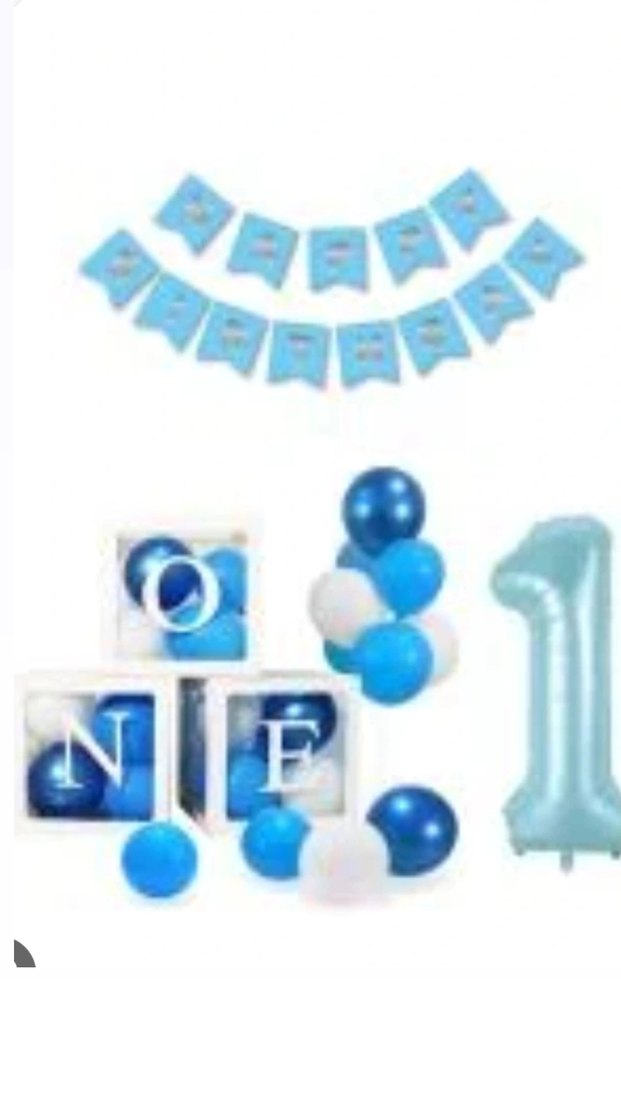 Açık mavi balonlar, küçük 1 rakam balonu ve pankart içeren 1 yaş kutlaması için parti süsleri seti . Balon kutusu dahildir