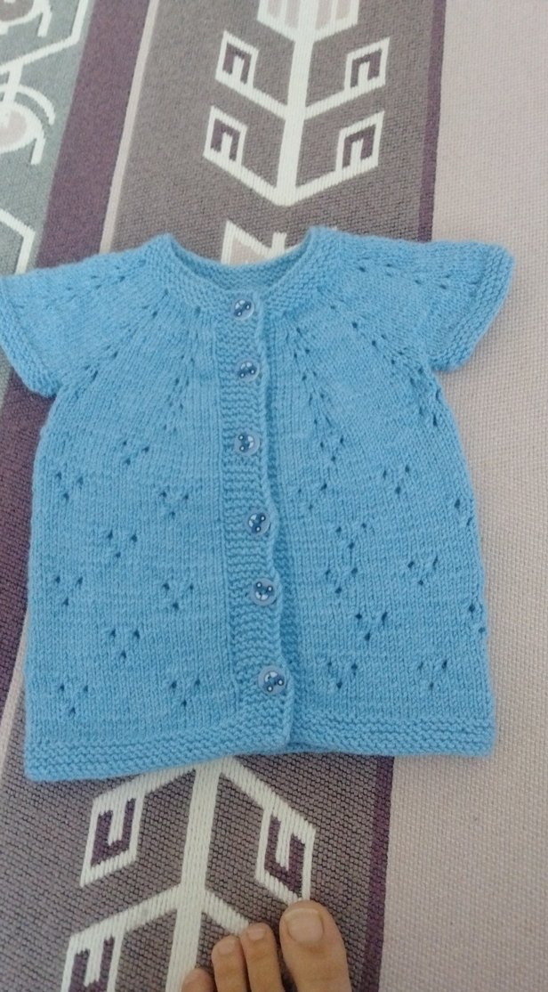 Mavi renkli, kısa kollu hamile hırkası, gevşek kesim ve yuvarlak yakaya sahip, örgü dokusuyla rahat ve sade bohem tarzda. Günlük kullanıma uygun kısa boyda.