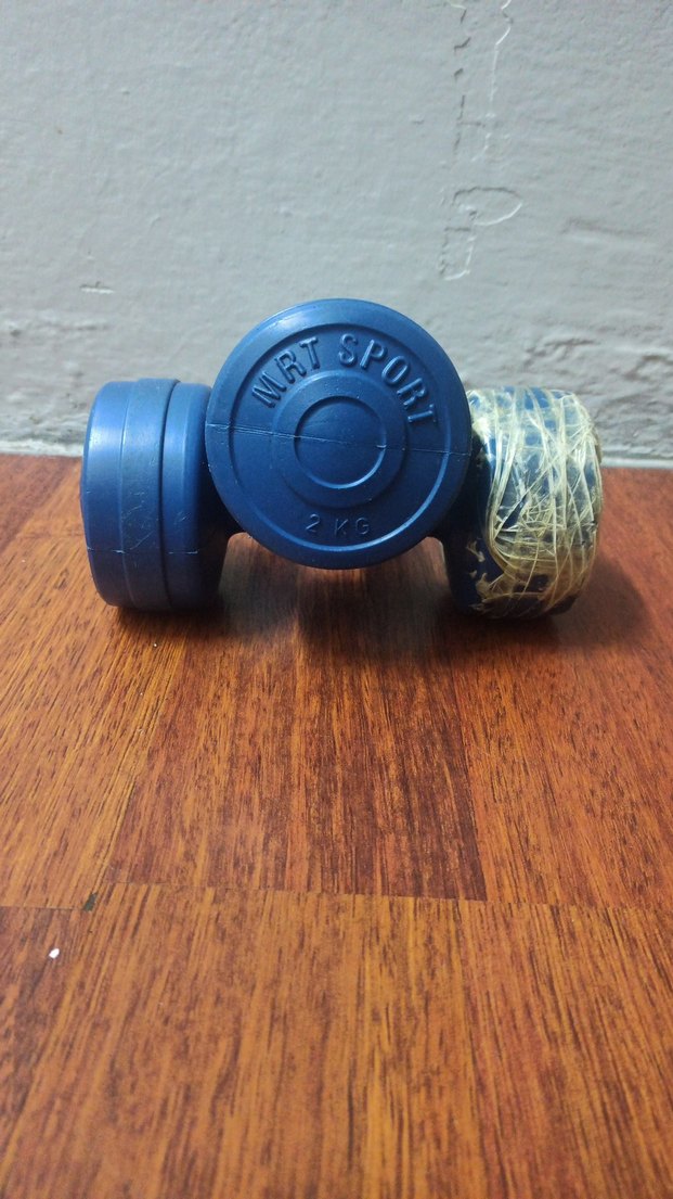 Mavi 2 kg dambıl, pürüzsüz yüzeye sahip, güç egzersizleri için uygundur. Gri sapı kavrama için sarılıdır. pazarlık vardır