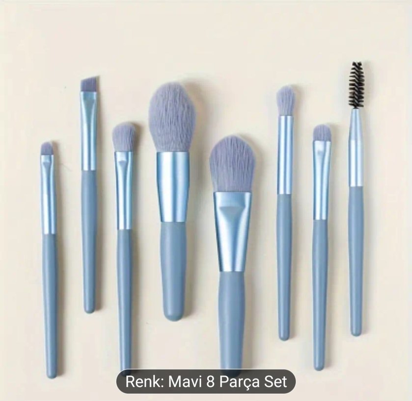 Mavi saplı ve yumuşak gri kıllara sahip 8 parça makyaj fırçası seti, farklı makyaj uygulamaları için uygundur. ️