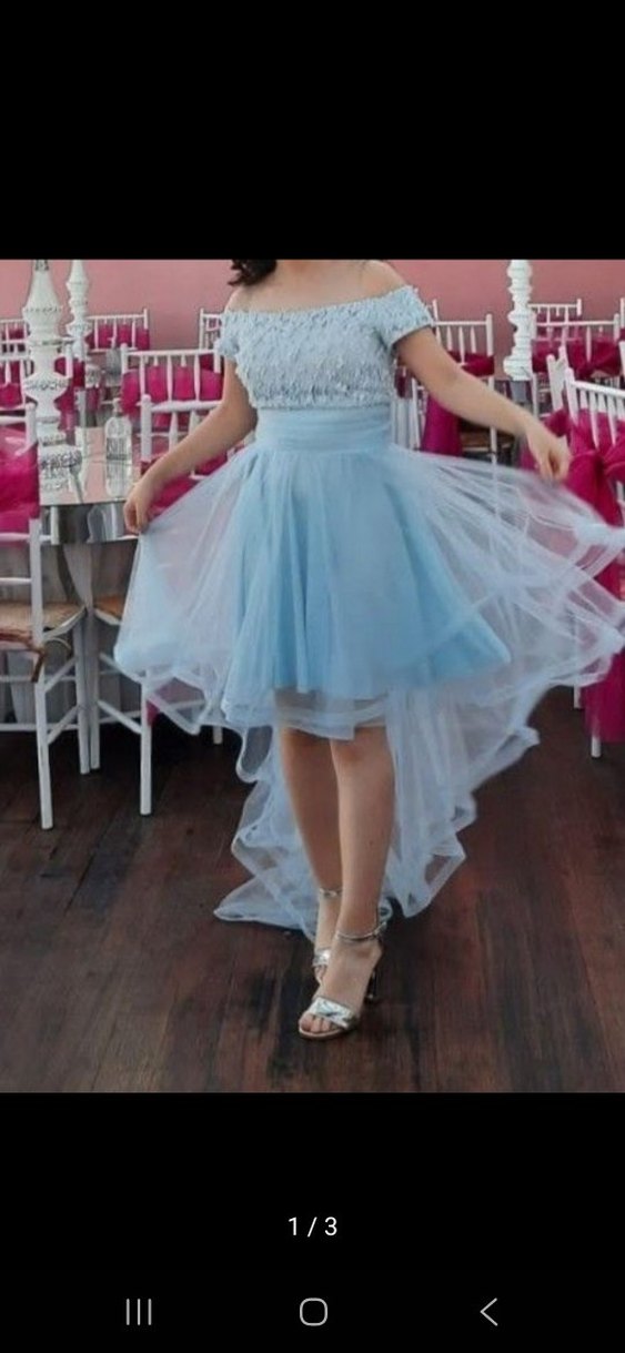 Açık mavi, straplez yakalı ve volan detaylı mini elbise, şık ve çağdaş tarzıyla partiler için uygun. Baskılı deseniyle dikkat çekiyor. Bir kez giydim sadece