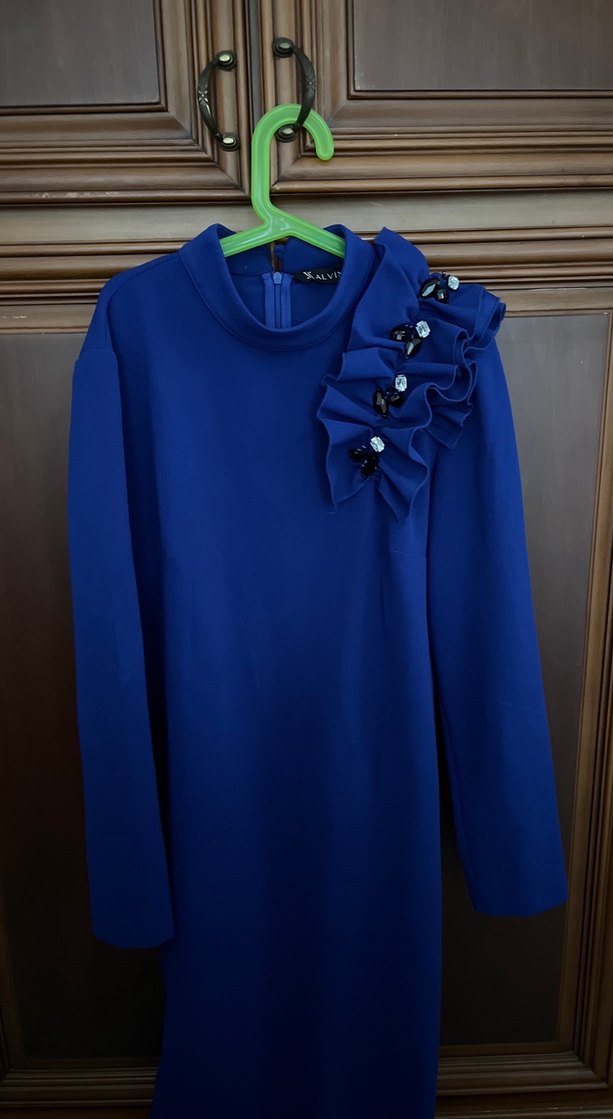 36-38 beden arası uyumludur Mavi, uzun kollu, yuvarlak yaka ve fırfır detaylı Şalıyla birlikte mevcuttur