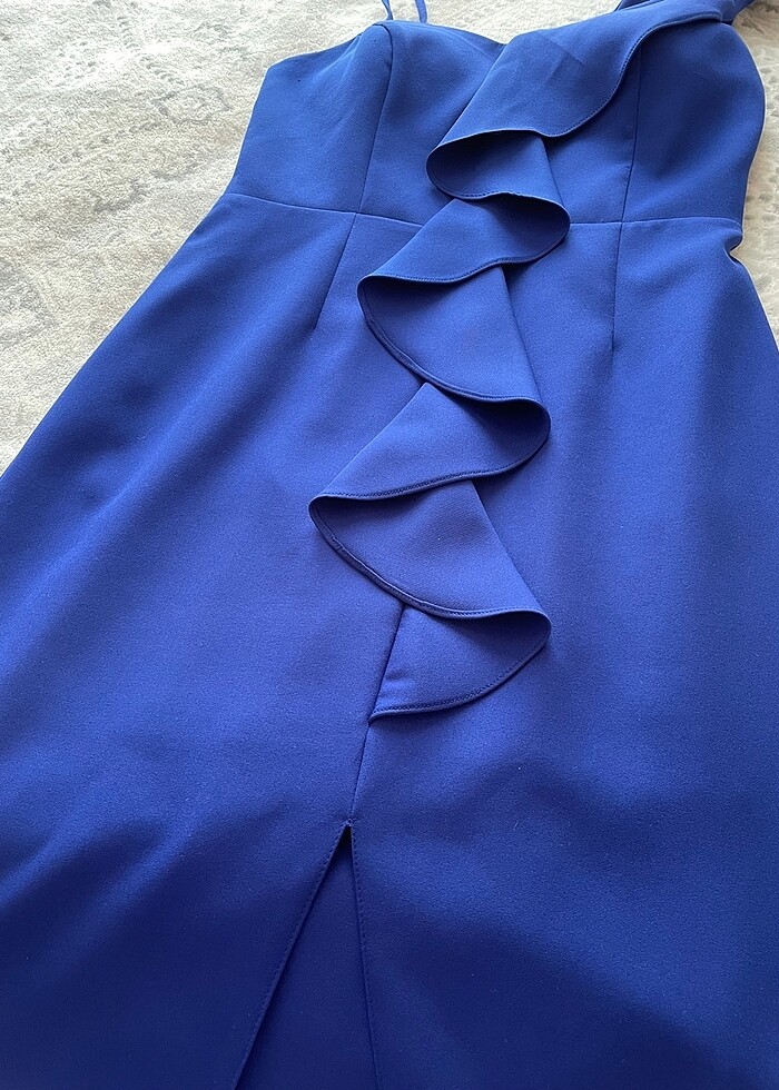 Saks mavisi abiye elbise 165 boy diz kapağında yırtmaç detaylı omuzları birisi askı detay birisi dökümlü detayı vardır göğüsten dize kadar inen dökümlü detayı vardır