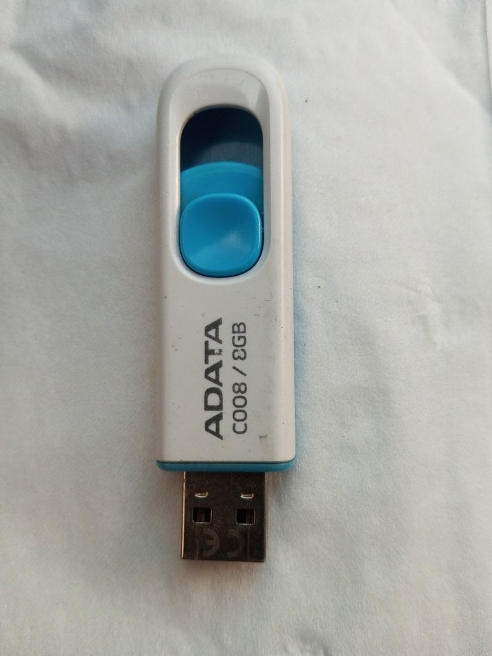 ADATA marka, 8GB depolama kapasitesine sahip, açık mavi plastik gövdeli USB flash bellek. Kaydırmalı USB konektörü bulunur.