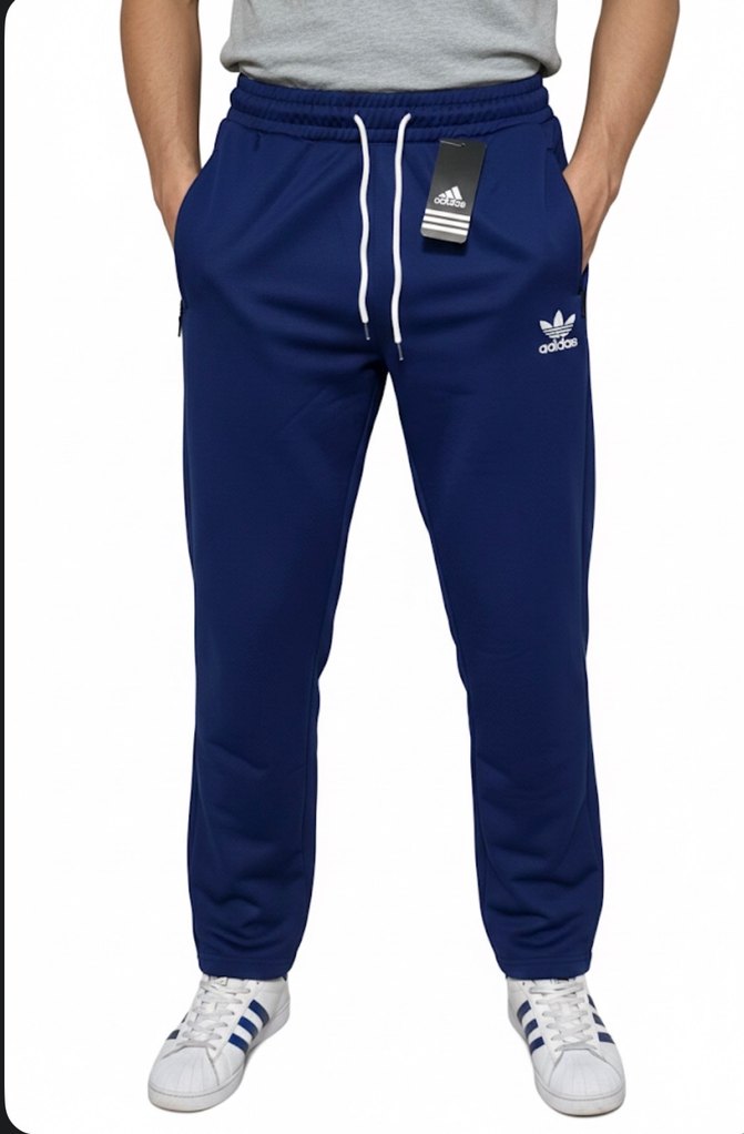 Yumuşak ve sıcak kumaştan yapılmış, bağcıklı bel ve normal kesime sahip mavi Adidas eşofman altı. Spor ve sokak stili için uygundur. Şardonsuz mevsimlik openet kumaştır.