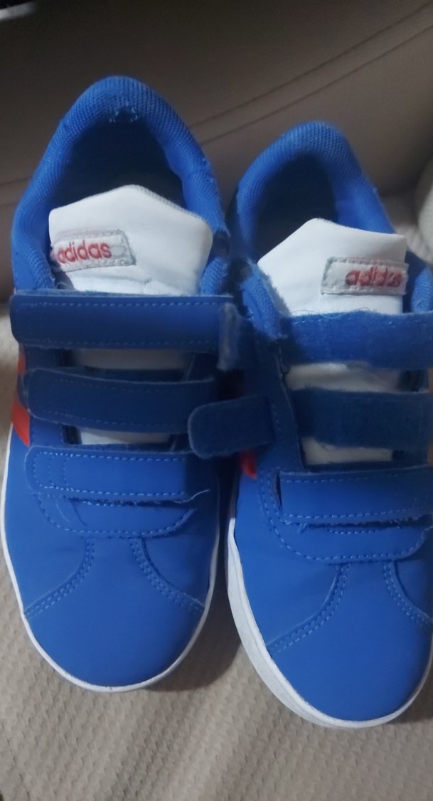 Mavi Adidas erkek çocuk spor ayakkabısı, cırt cırtlı, kauçuk tabanlı ve sade sokak stili ile rahat kullanıma uygun.