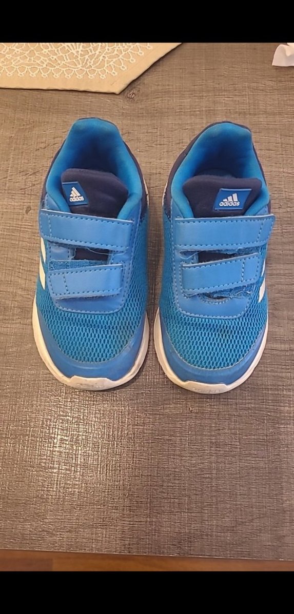 Mavi Adidas erkek çocuk spor ayakkabısı, cırt cırtlı ve kauçuk tabanlı, rahat sokak stili için uygun. Renkli ve desensiz tasarım.