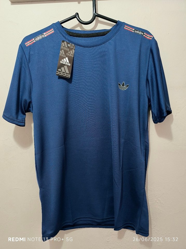 Mavi Adidas kısa kollu tişört, rahat kesim ve yuvarlak yaka ile spor tarzı sunar, omuzlarda baskılı detaylar bulunur.
