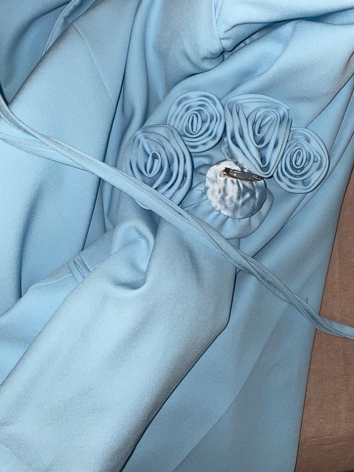mavi ikili takım pantalon ve blazer ceketten oluşuyor renkli çiçek şeklinde broşürleri mevcut istediğiniz yerde takabilirsiniz ince mavi kumaşlı kemeri de mevcut bi kere giyildi