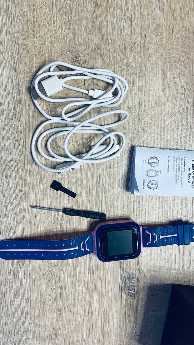 Koyu mavi tonlarında akıllı saat, beyaz şarj kablosu, kullanım kılavuzu ve küçük bir tamir aracı ile birlikte. ⌚ Çocuk Akilli Saat Orijinal paketinde sifir. 4.5G + sim kart+ yedek kordon + yedek sarj+ görüntülü konusma + whaatsap + konum takip vs. #watch #akillisaat